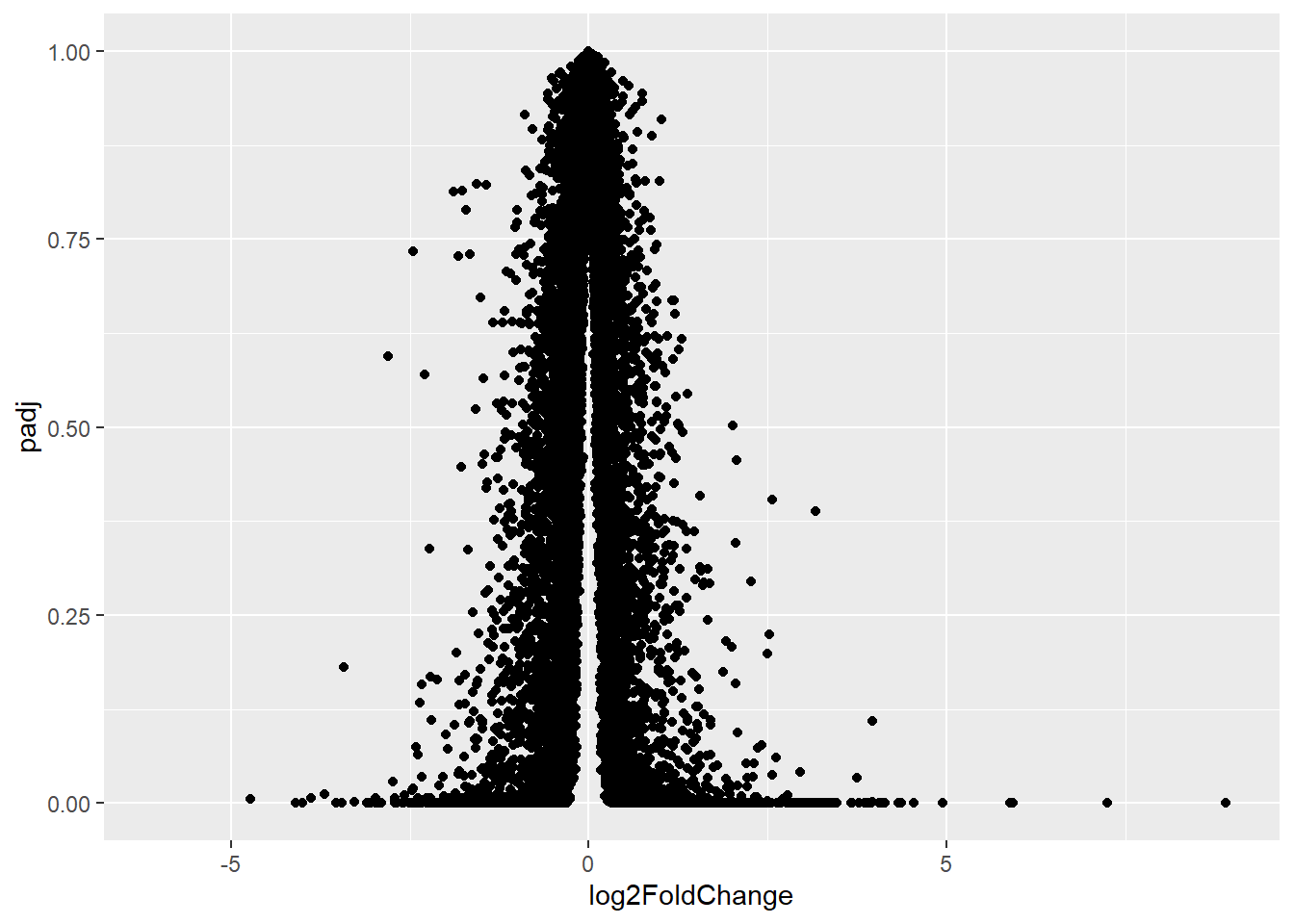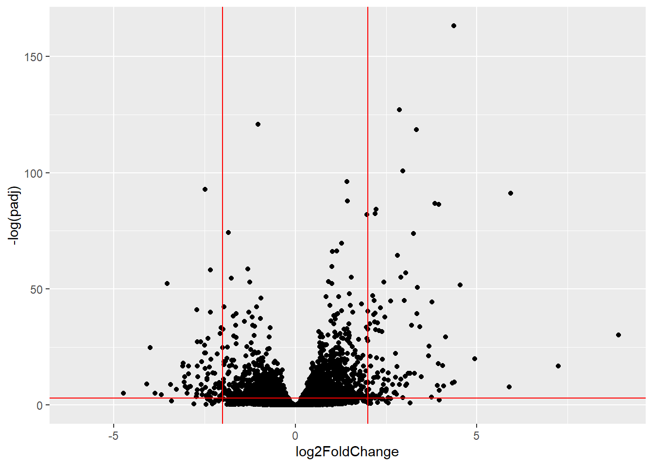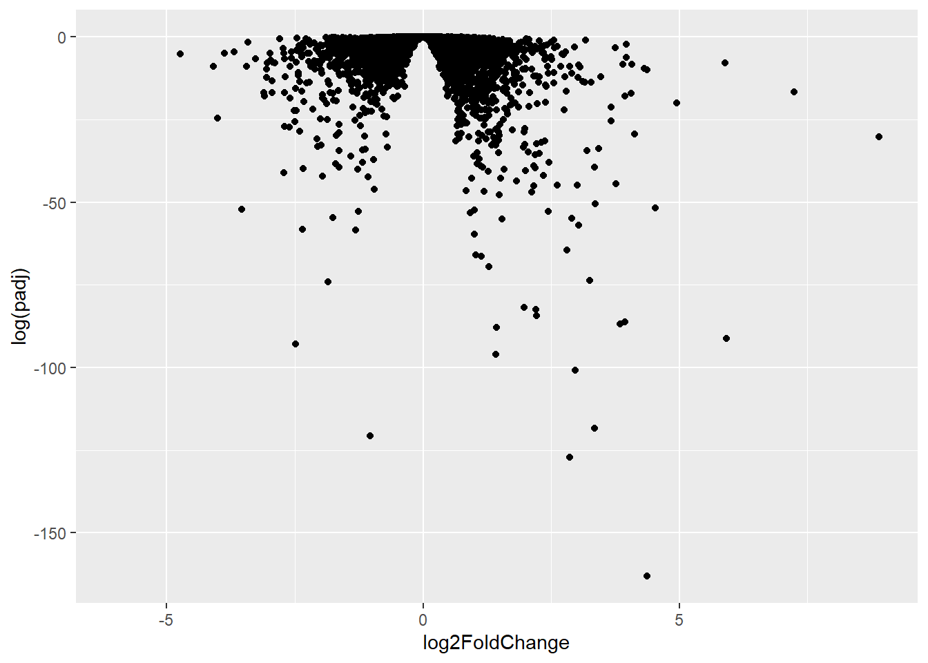 aes(x= log2FoldChange, y= -log(padj)) +
