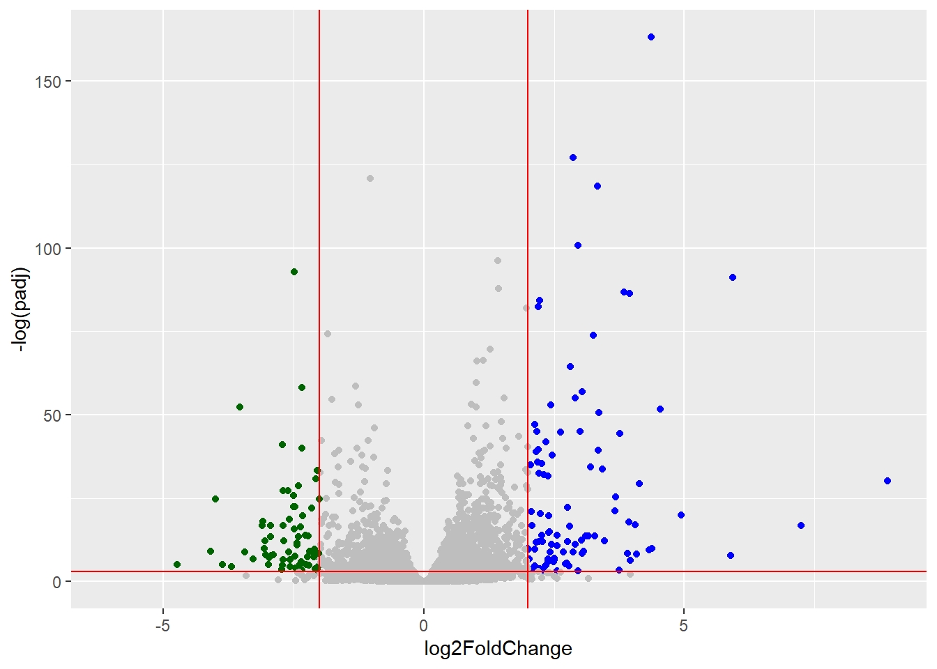 mycols[res$log2FoldChange < -2] <- "darkgreen"