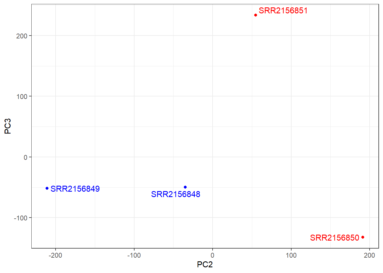 aes(PC2, PC3, label=rownames(pca$x)) +